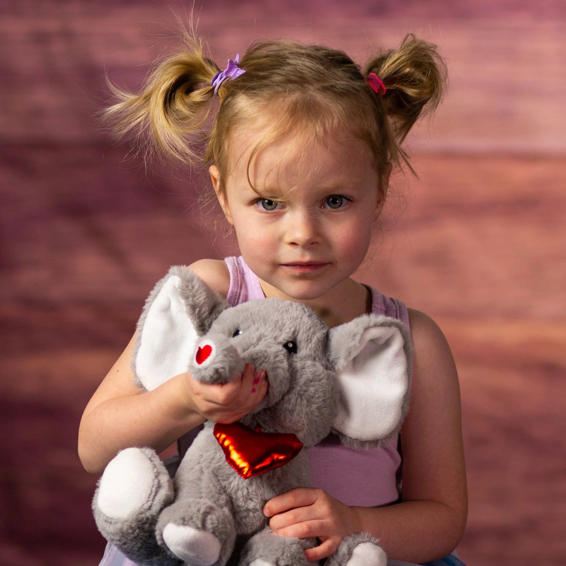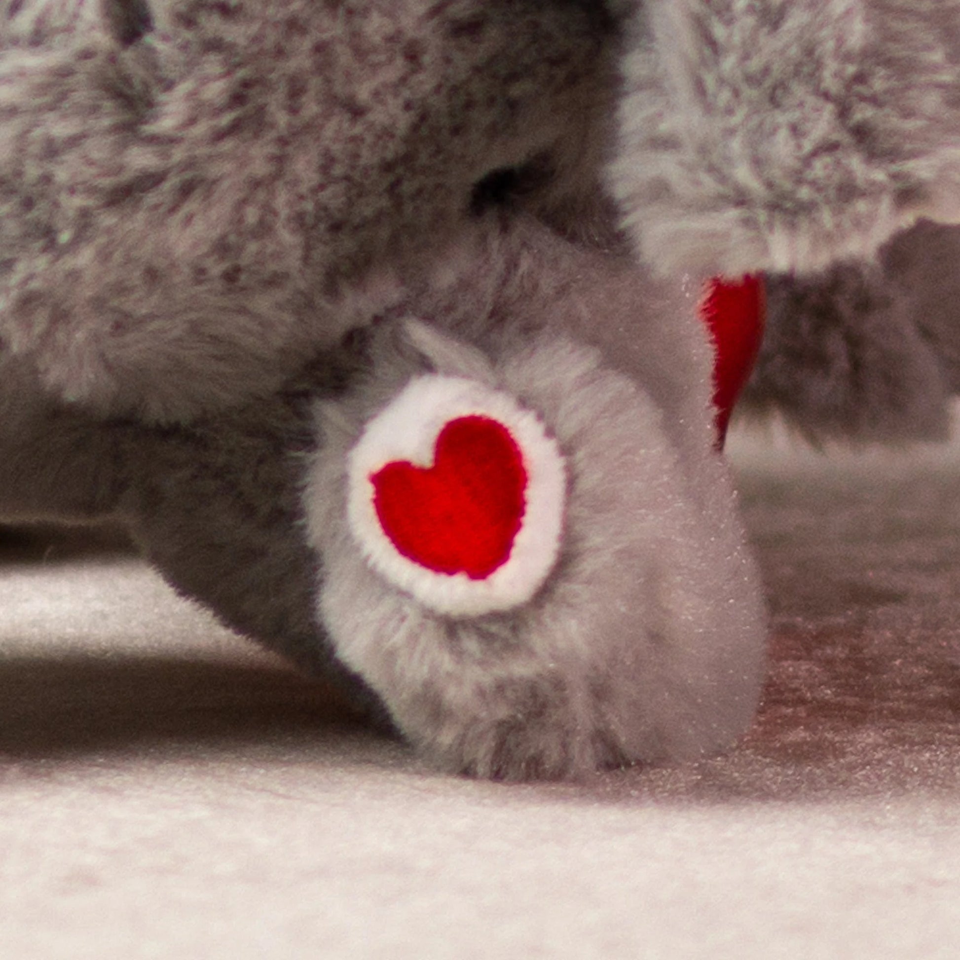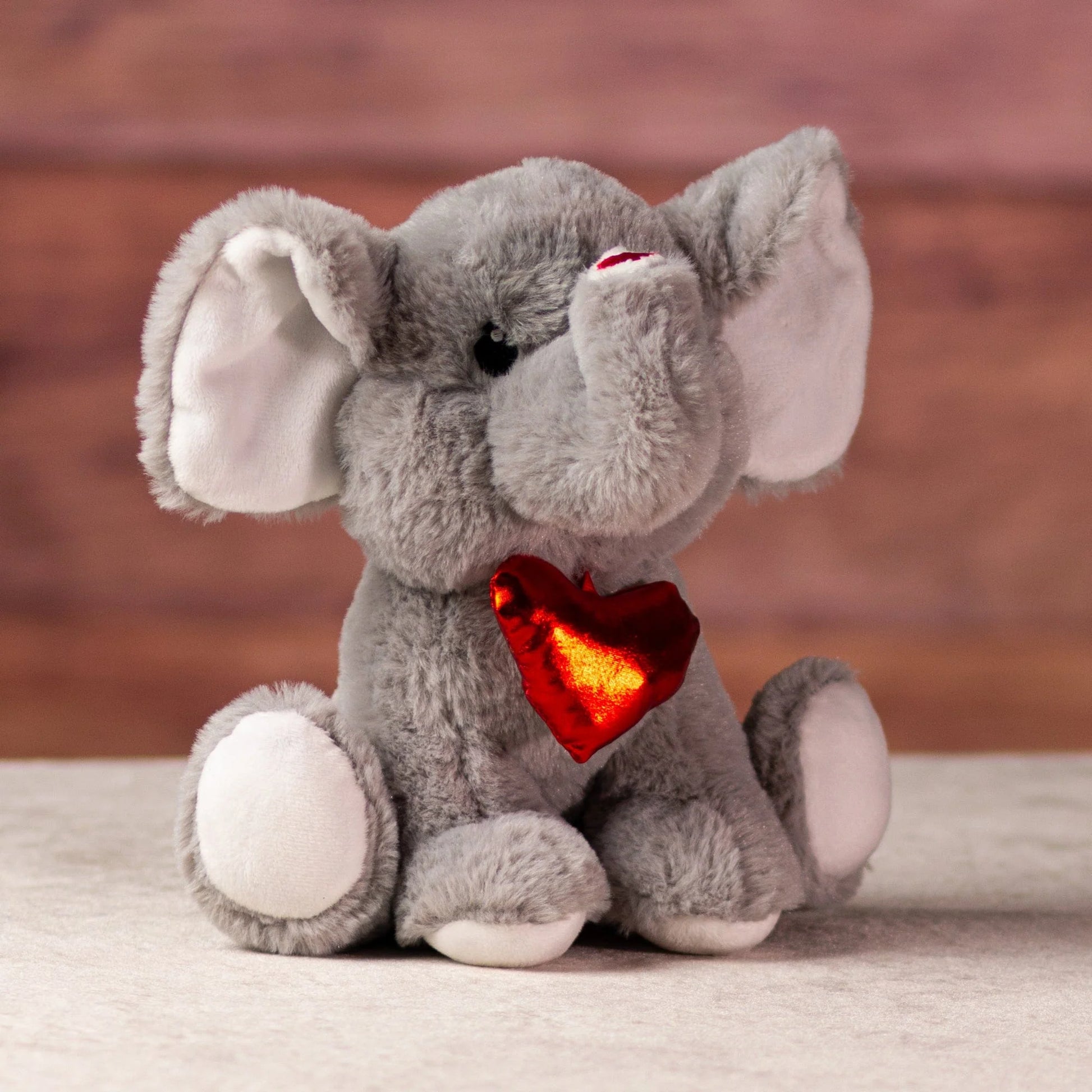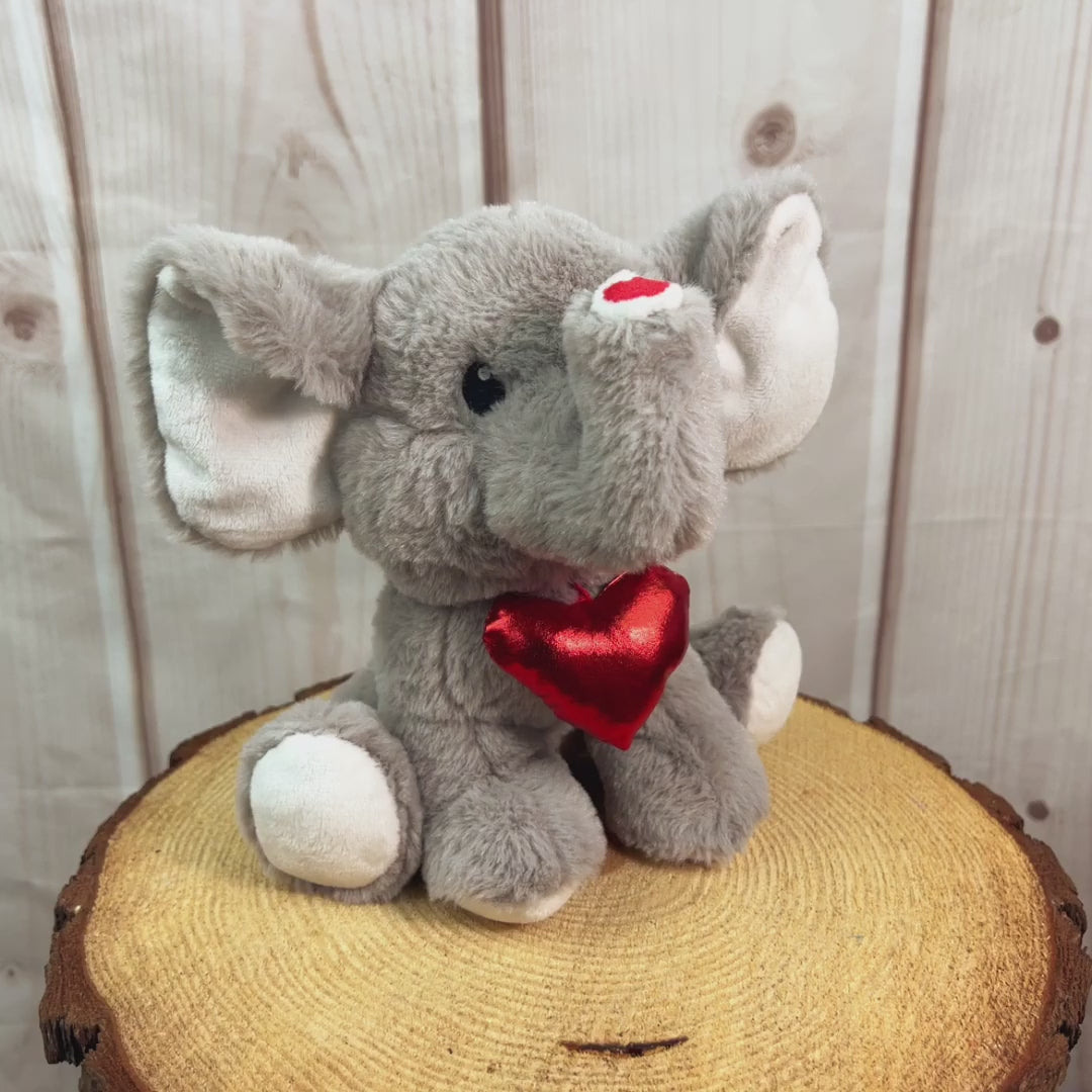 This lovable elephant has a sweet face and a big red sparkly heart dangling on its neck. The fur has that soft gray color and there's even a heart on the tip of its trunk. Check out the picture with the trunk detail.