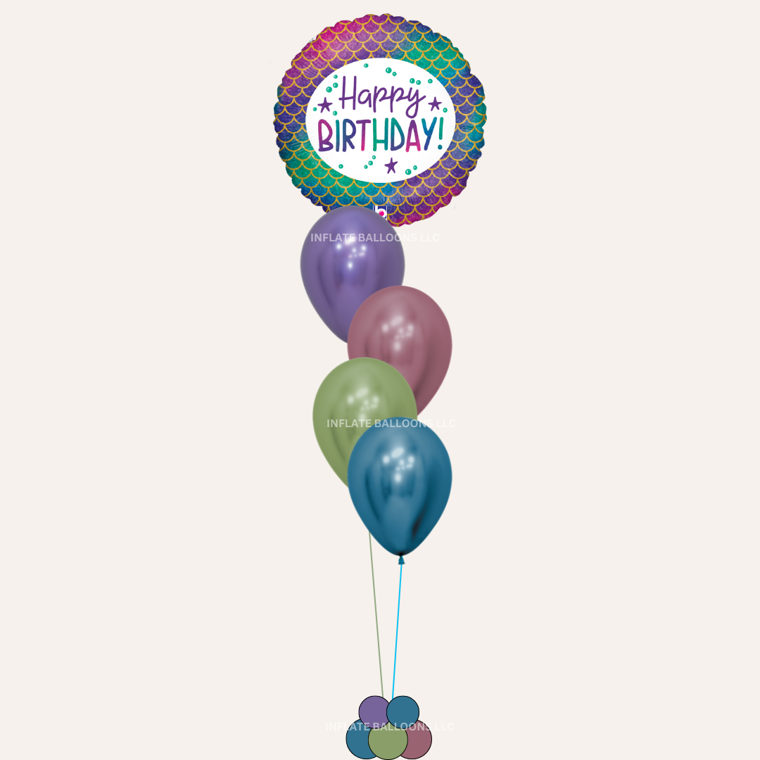 The bouquet includes the following 5 helium-filled balloons attached to a weight of your choice.