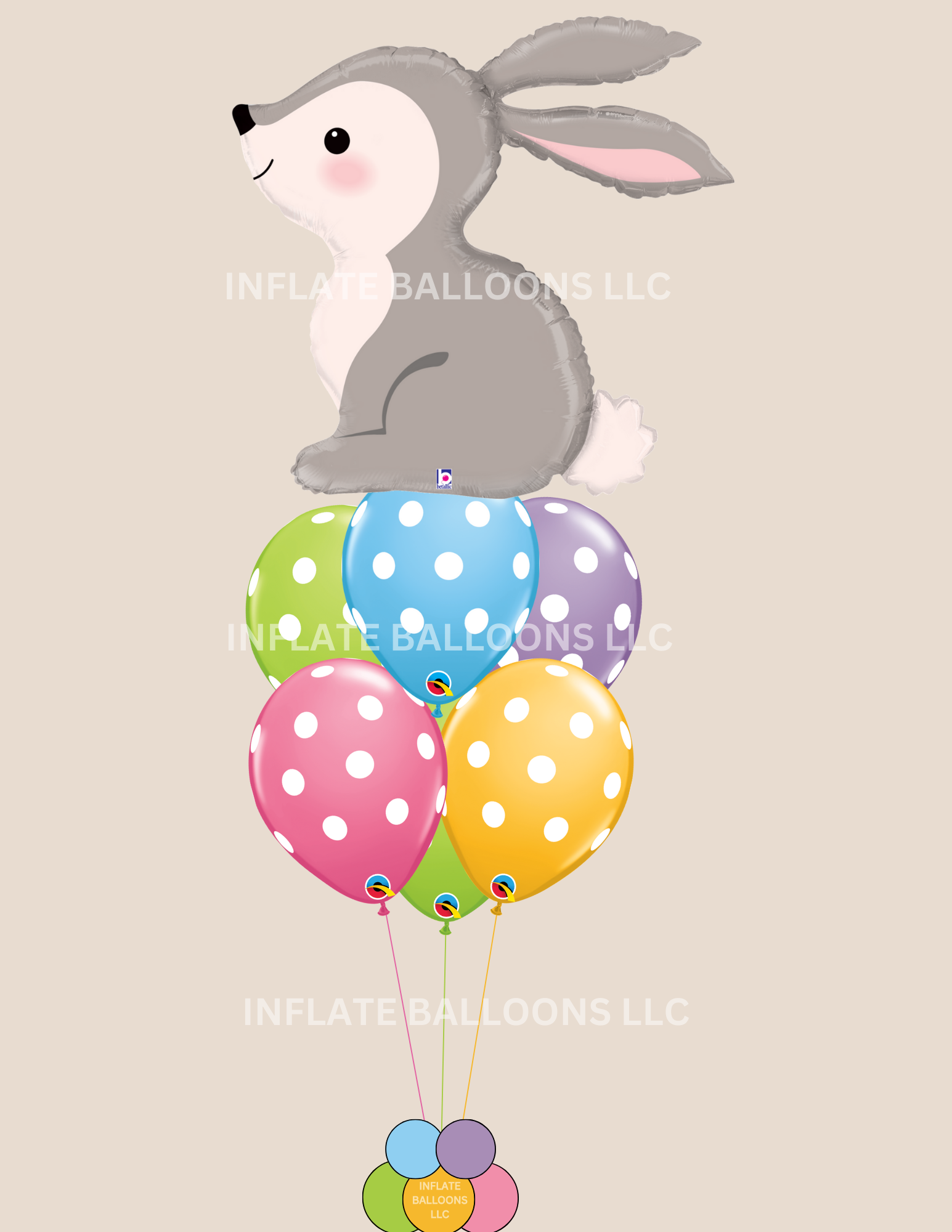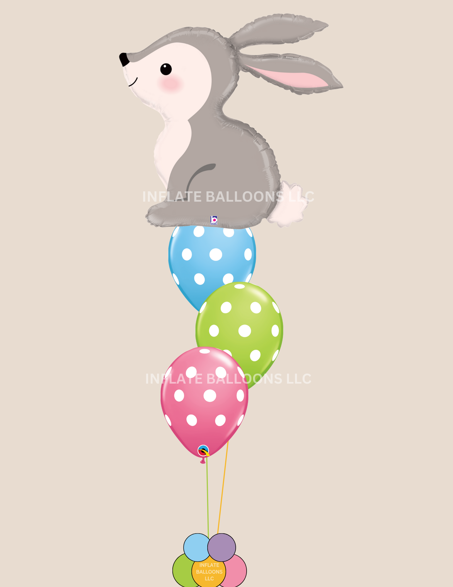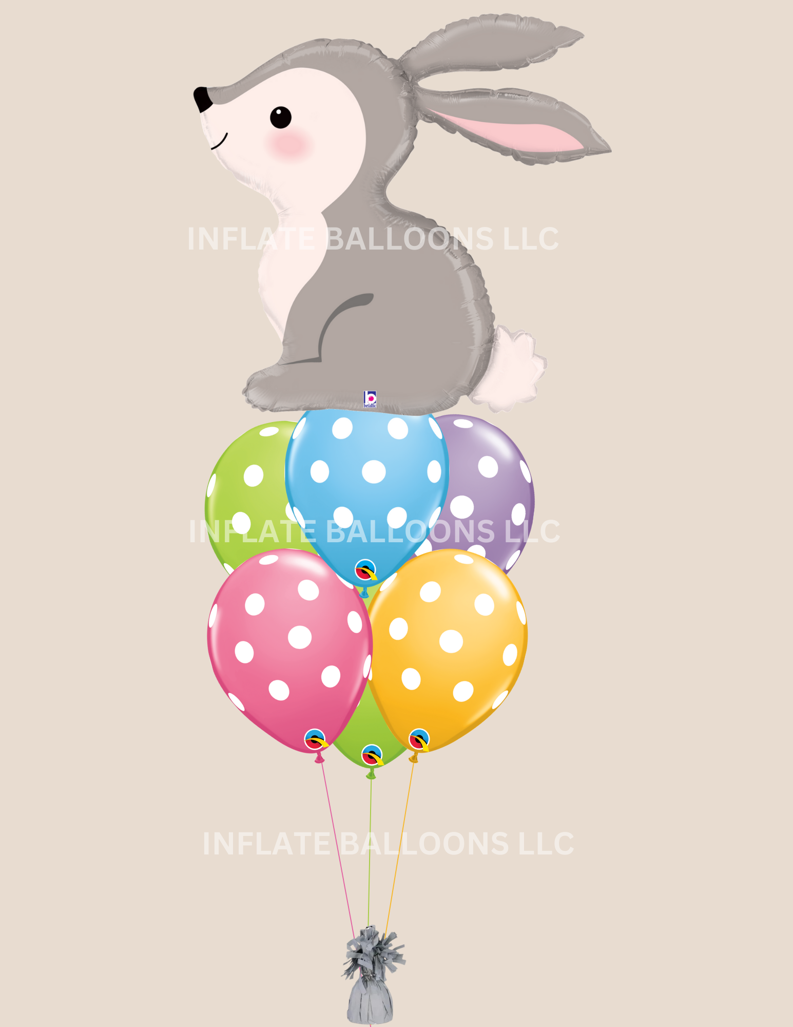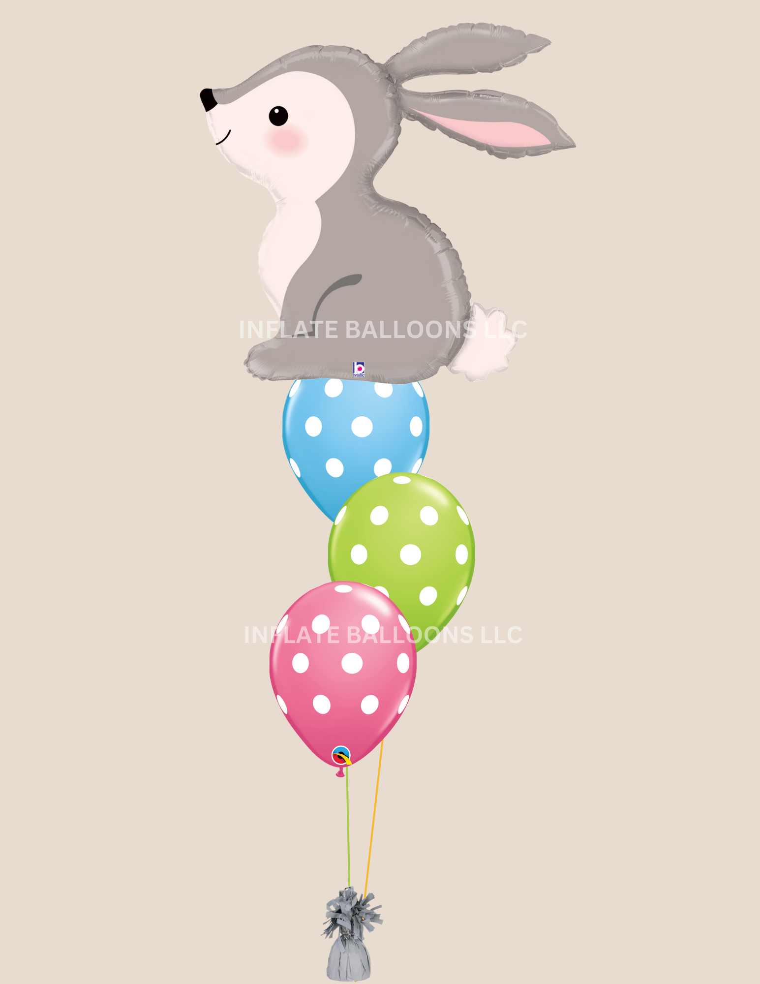 This bouquet includes our 31" woodlands bunny & assorted polka dot latex helium filled and attached to a weight of your choice